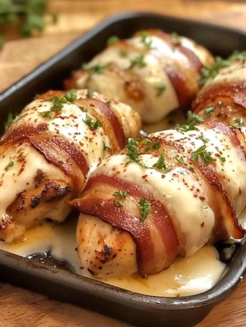 Bacon-wrapped cream cheese-stuffed chicken breasts are a delicious and savory dish that combines tender chicken, creamy filling, and crispy bacon. It’s a crowd-pleasing recipe that’s easy to make. Here’s a simple recipe you can try:
