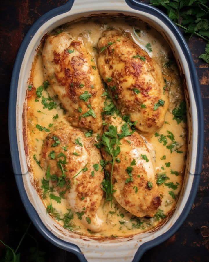 Here’s a simple, flavorful, and family-friendly dinner: Baked Caesar Chicken — juicy chicken breasts smothered in creamy Caesar dressing, baked to perfection, and topped with Parmesan. It’s rich, savory, and requires only a handful of ingredients!