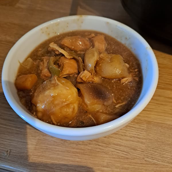 • Ladle warm casserole onto plates, scoop fluffy dumplings on top.