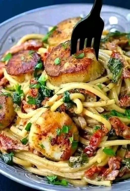 🍝 Creamy Tuscan Spaghetti with Jumbo Scallops