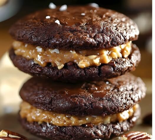 Here’s a decadent treat with a twist: German Chocolate Whoopie Pies soft chocolate cake-like cookies sandwiched with a rich coconut-pecan filling, just like the classic German chocolate cake!