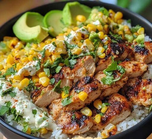 Here’s a vibrant, healthy and delicious Street Corn Chicken Rice Bowl recipe packed with grilled chicken, roasted corn, fresh veggies, zesty sauce, and fluffy rice. It’s inspired by Mexican street corn (elote), but made into a satisfying, balanced meal.
