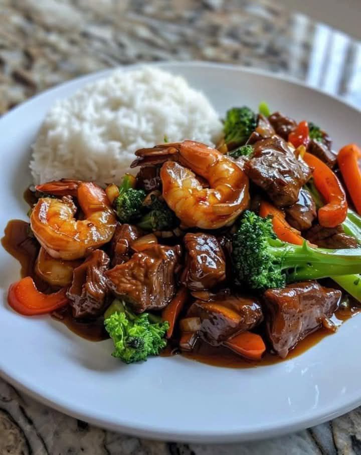 Return beef and shrimp to the pan, pour glaze over, and toss gently to coat.
